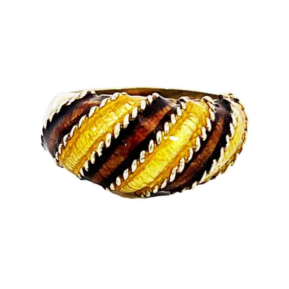 This elegant 14K Yellow Gold Dome Ring is crafted with a beautiful brown enamel coating that adds a touch of sophistication to its simple design. The 4mm comfortable band fits perfectly on a size 7 finger while the hypoallergenic gold material makes it safe for individuals with sensitive skin. Long-lasting and durable, this stunning piece is perfect for everyday wear or special occasions.