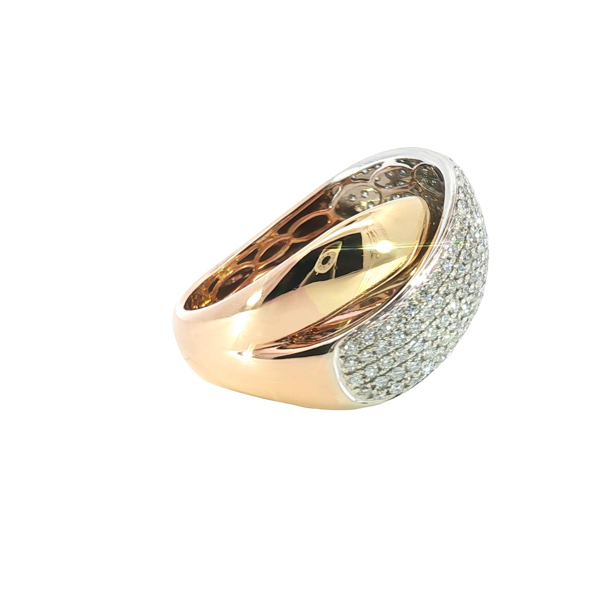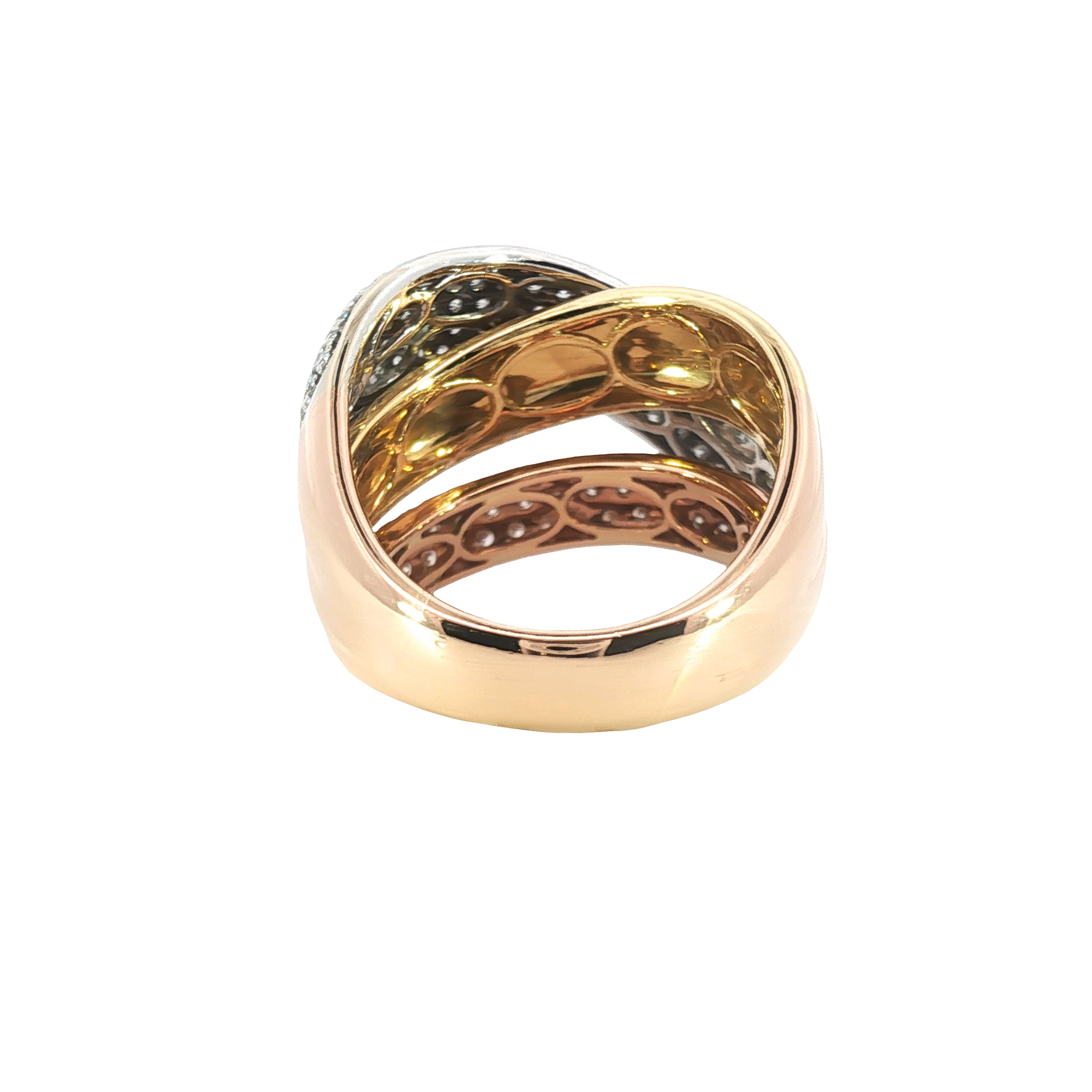 Indulge in the mesmerizing allure of this diamond statement ring, crafted in radiant 18K tri-tone white, yellow, and rose gold. Showcasing brilliant-cut round diamonds set in an intricate arrangement. This bold, modern piece embodies luxury and sophisticated style, making it perfect for creating an unforgettable sight to behold.