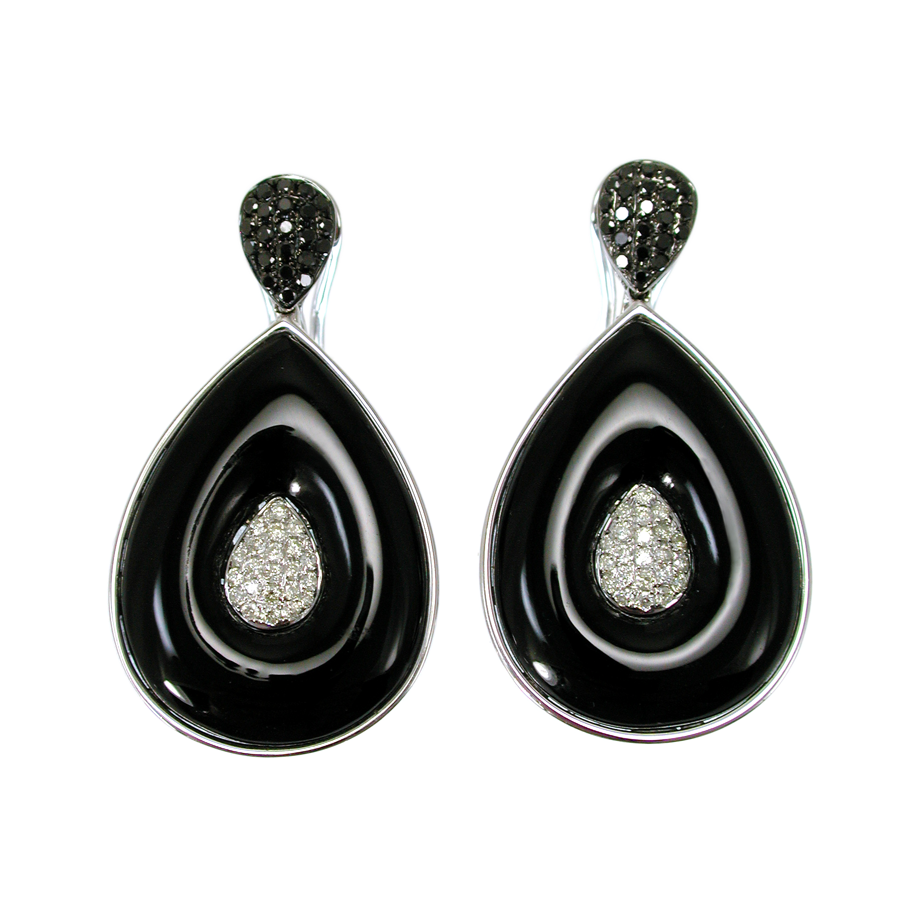 18K White Gold Pear Shaped Onyx and Diamond Drop Earrings