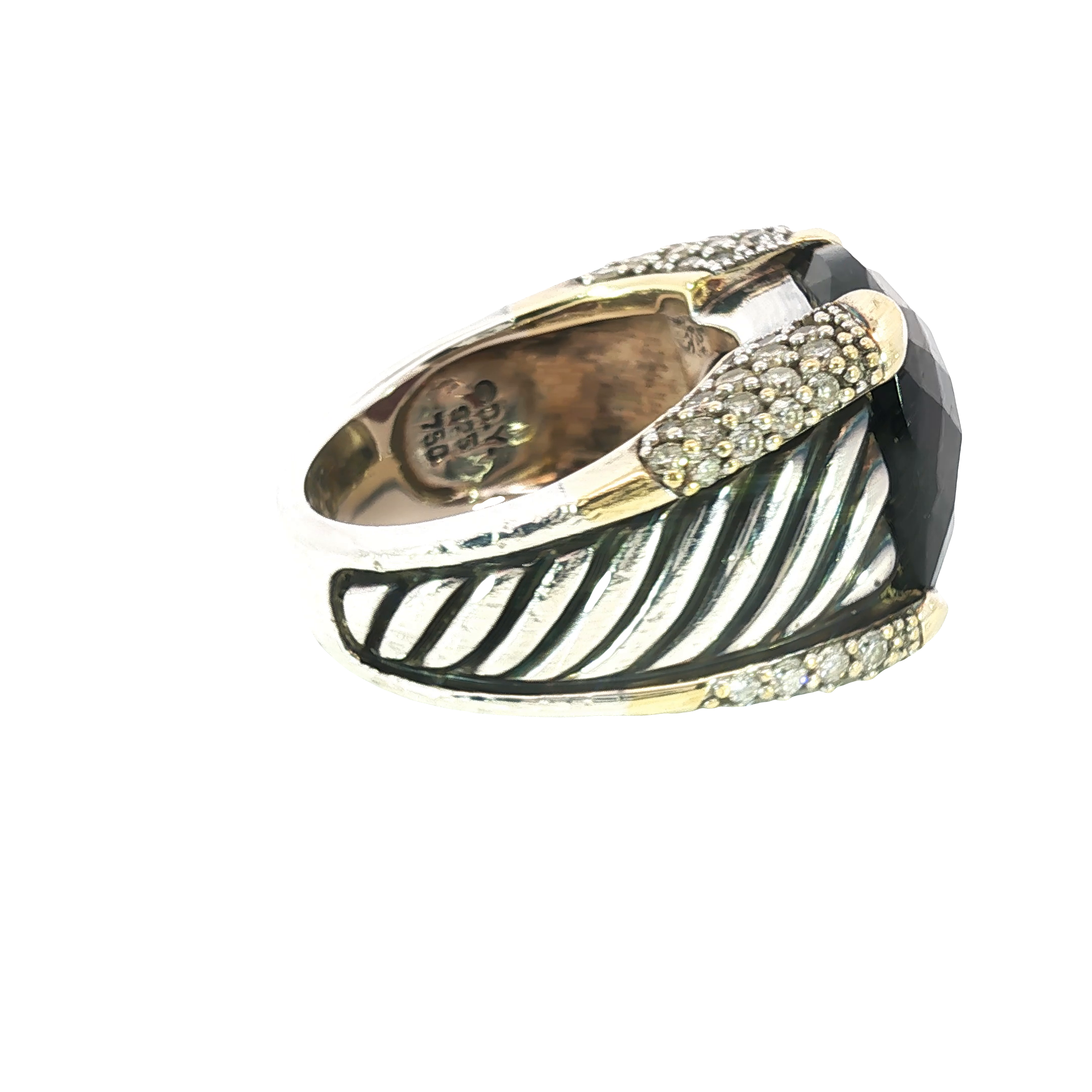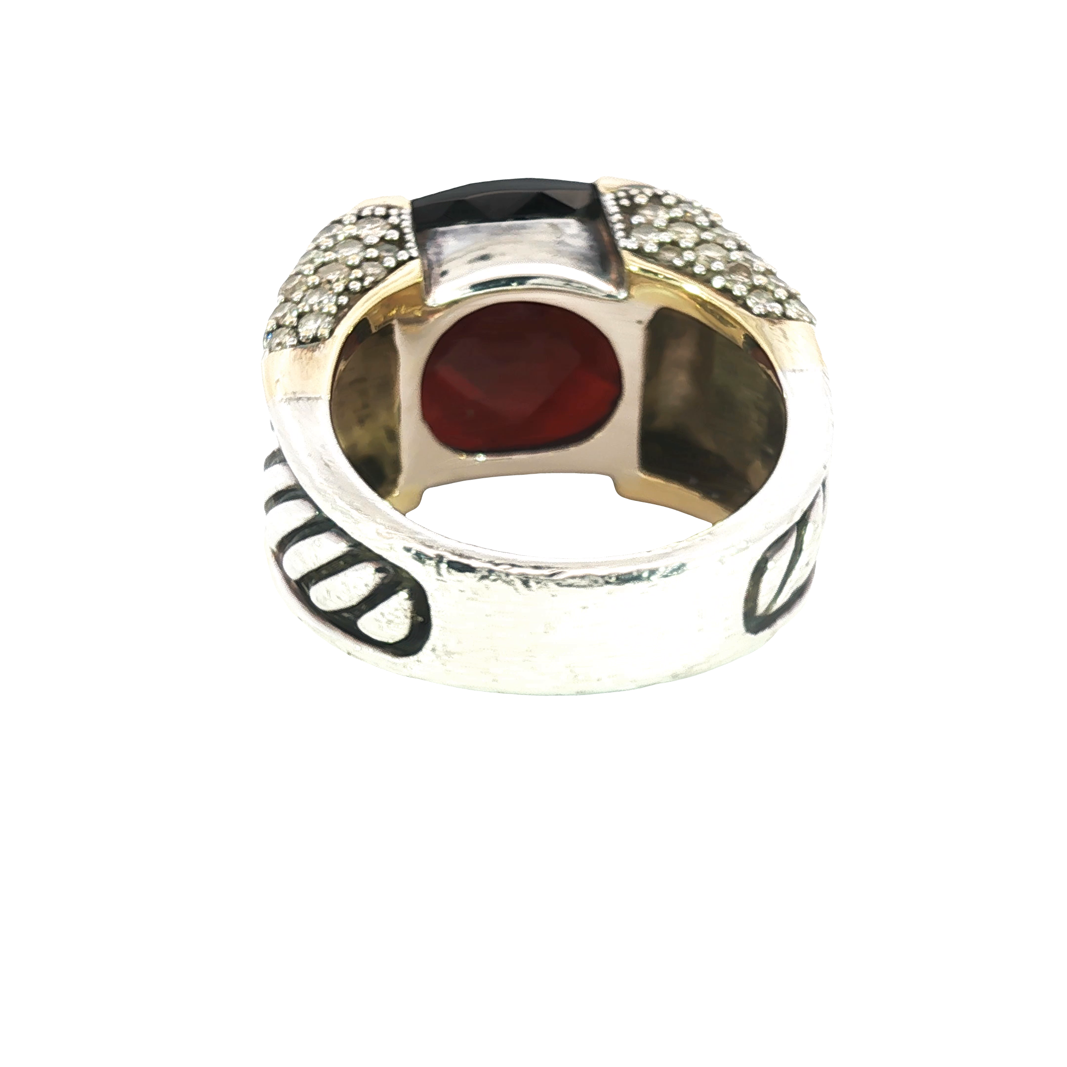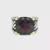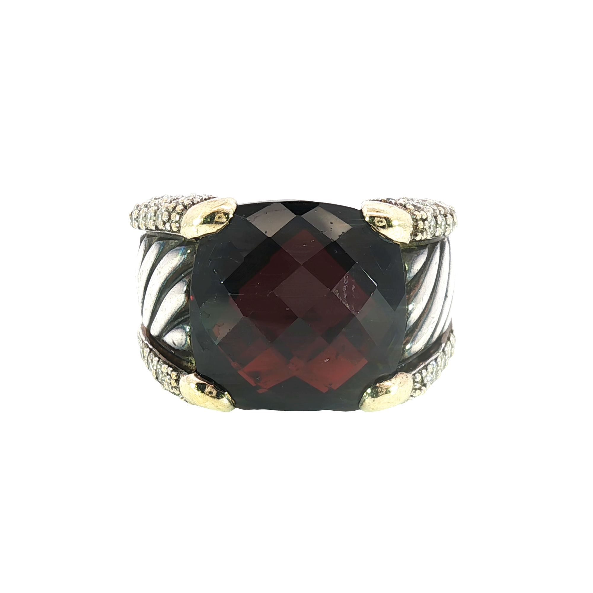 Indulge in the allure of this captivating 18K yellow & sterling silver estate David Yurman ring, showcasing a meticulously cut cushion shaped garnet that has a checkerboard faceted top. The deep red hue of the garnet, combined with the ring's bold design, creates a statement piece that exudes sophistication and charm.