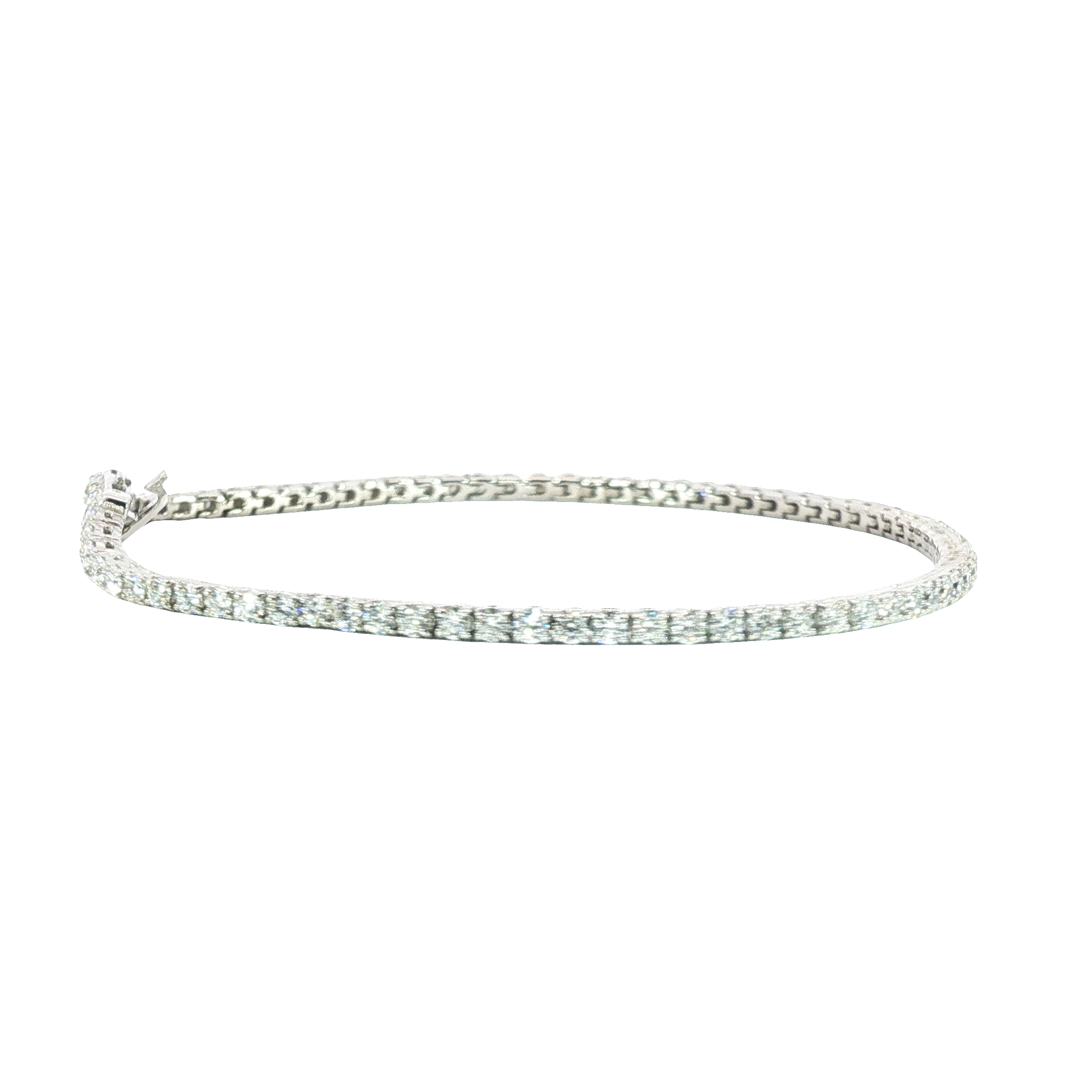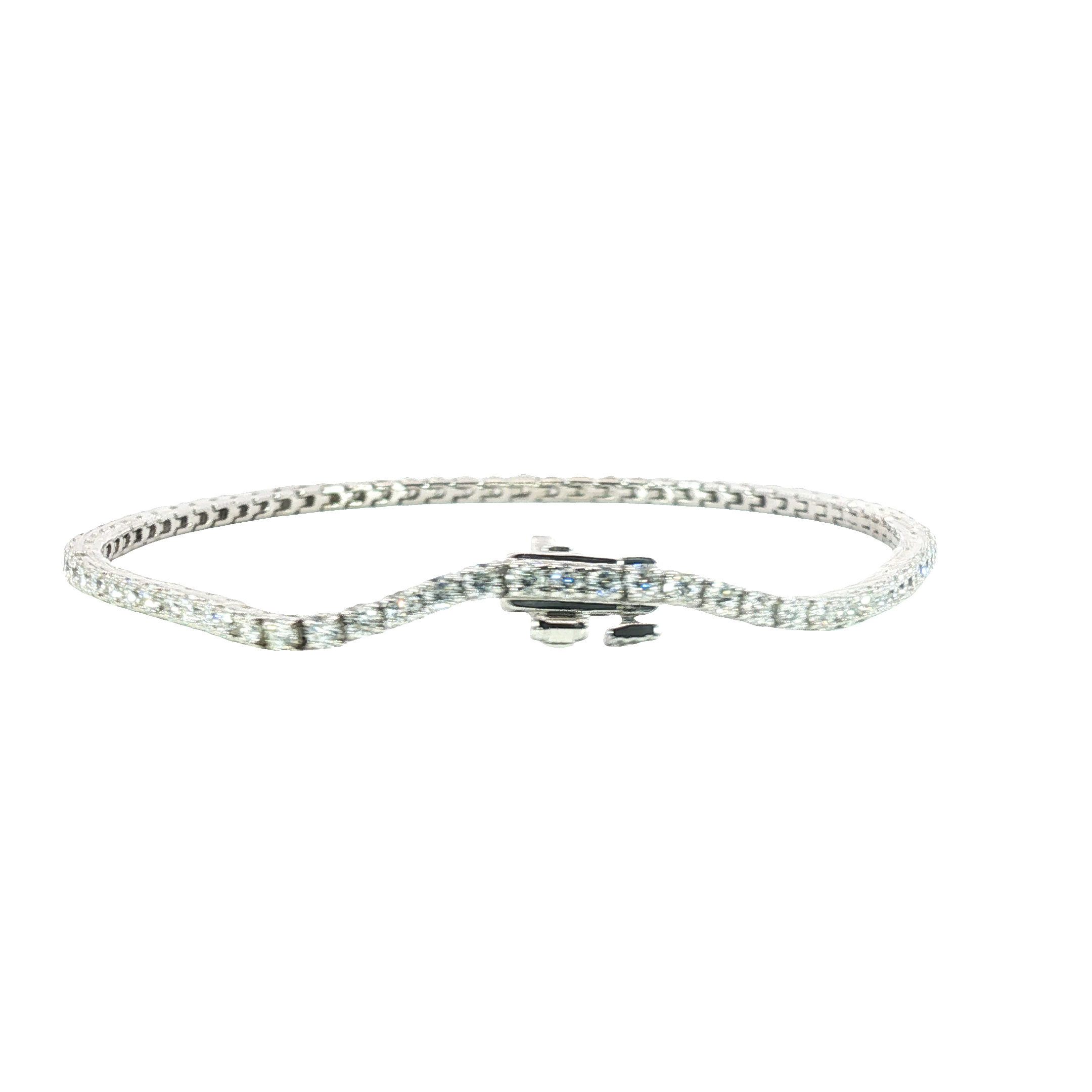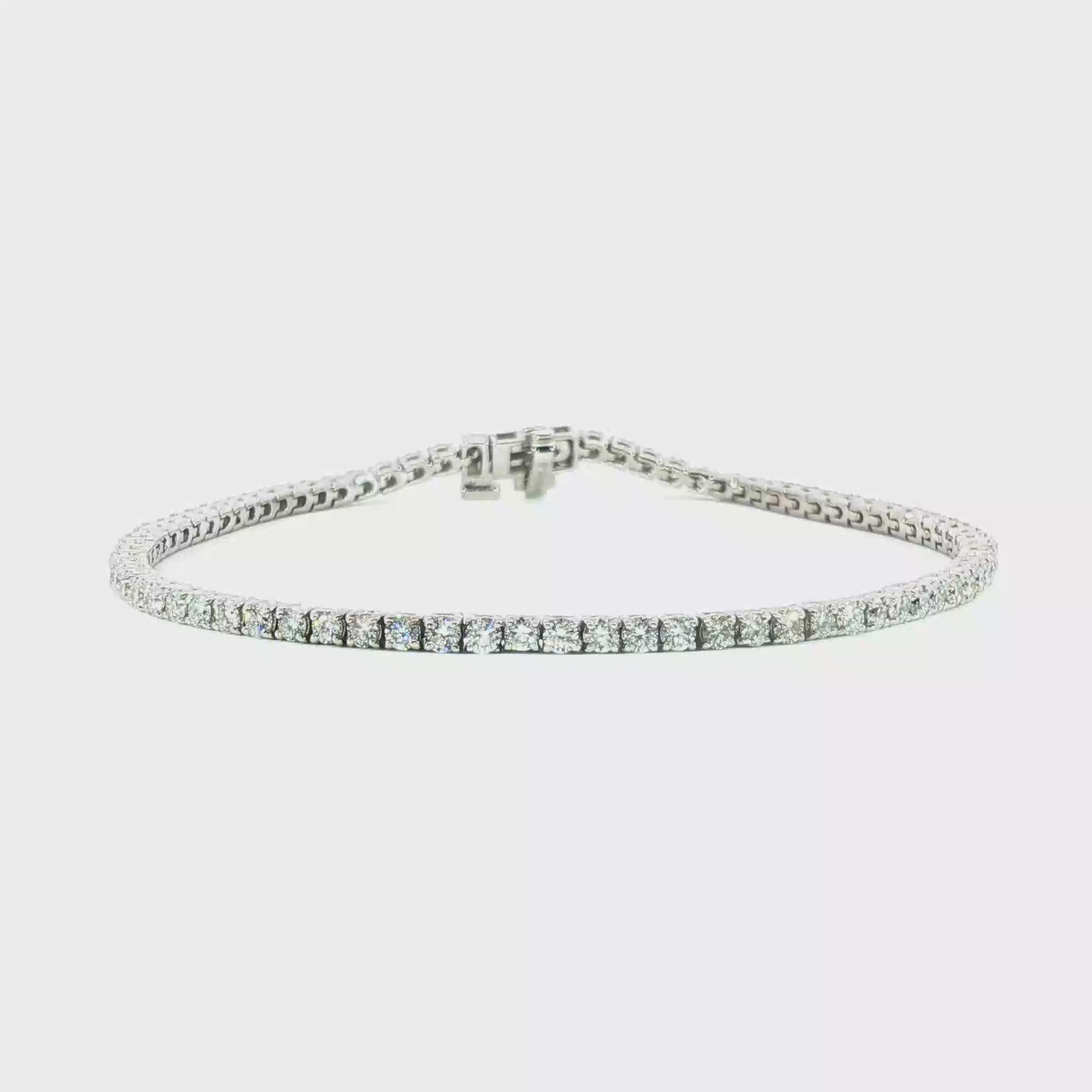 Elevate your style with this stunning 14K white gold lab grown diamond tennis bracelet. Each round brilliant cut diamond is meticulously set in a sleek white gold prong setting. This timeless design exudes sophistication, making it the perfect accessory for any occasion. The secure clasp ensures a comfortable and secure fit, allowing you to shine with confidence.